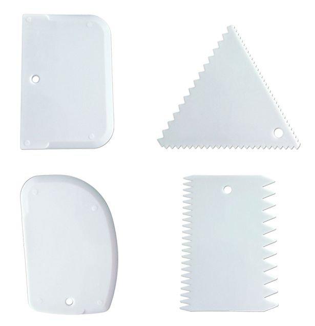 4'lü plastik kazıyıcı set,içerisinde bulunan 3 adet kazıyıcı ile hamur kazıma,kesme veya şanti,krema düzleştirici olarak kullanabilir diğer şanti tarağı ile